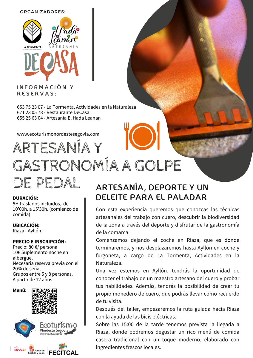 Con esta experiencia, conocerás las técnicas artesanales del trabajo con cuero, después descubrirás la biodiversidad de la zona a través del deporte haciendo una ruta en ebike de Ayllón a Riaza y para terminar, disfrutarás de la gastronomía de la comarca en Rte. De Casa.